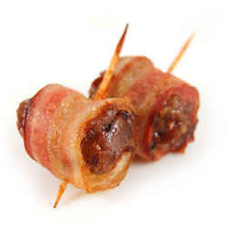 Завернуть каждый кусочек куриной печени и кусочки каштана в бекон и закрепить зубочисткой.