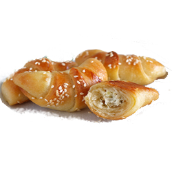 Один из них взять в руки за широкую сторону и острый угол, противоположный ей, и аккуратно растянуть в длину руками. Вернуть тесто на рабочую поверхность. Положить 25гр., начинки на широкую сторону треугольника, завернуть его углы к центру на начинку и скрутить.